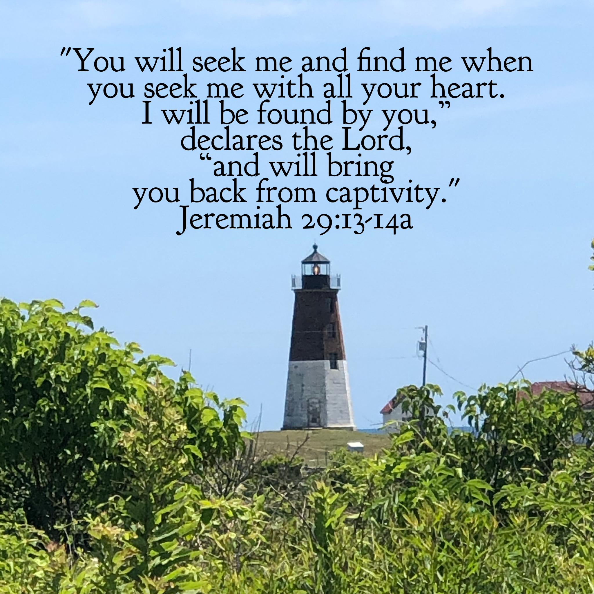 ” ‘For I know the plans I have for you,’ declares the Lord, ‘plans to prosper you and not to harm you, plans to give you hope and a future. Then you will call on me and come and pray to me, and I will listen to you. You will seek me and find me when you seek me with all your heart. I will be found by you,’ declares the Lord, ‘and will bring you back from captivity.’ ” Jeremiah 29:11-14a