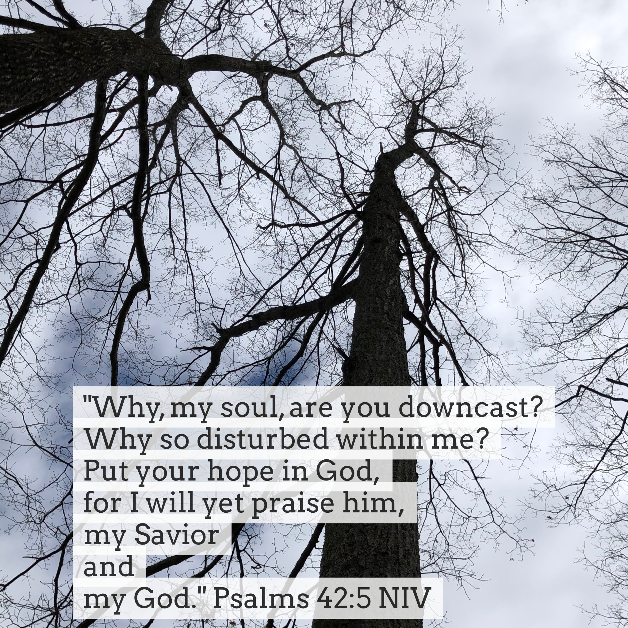“Why, my soul, are you downcast? Why so disturbed within me? Put your hopes God, for I will yet praise him, my Savior and my God.” Psalm 42:5 (NIV)